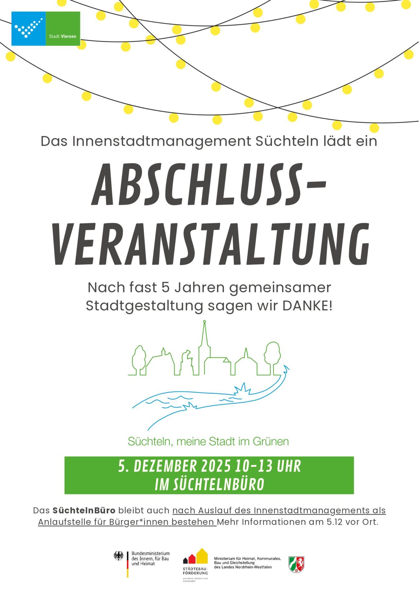 Am 5. Dezember laden wir euch herzlich zur Abschlussveranstaltung ins Süchtelnbüro ein. Von 10 bis 13:00 Uhr blicken wir zurück, tauschen uns aus und feiern die gemeinsame Zeit. Kommt vorbei für Kaffee und Kuchen!