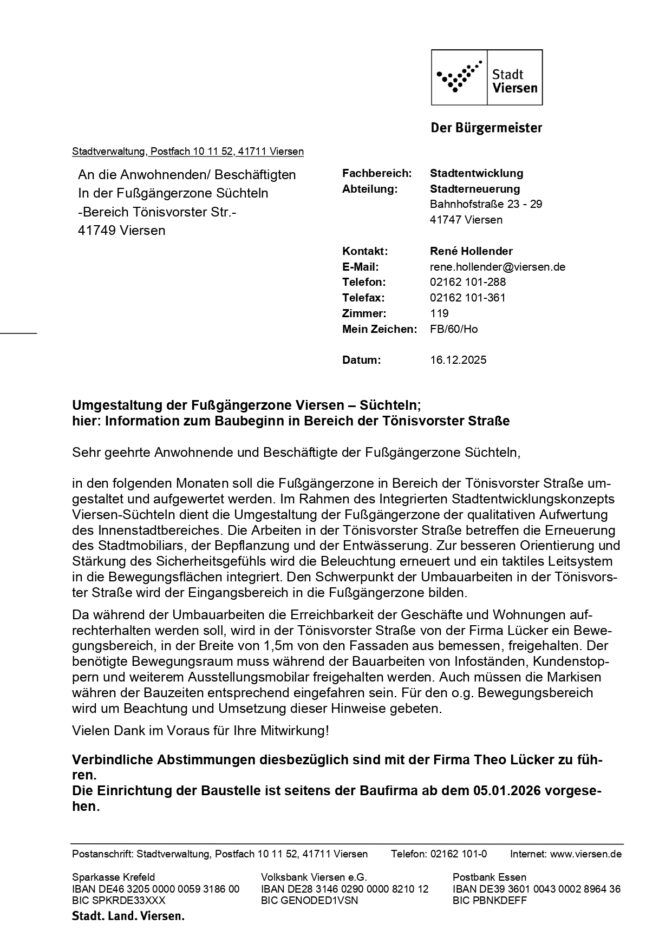 Umgestaltung der Fußgängerzone Viersen – Süchteln; hier: Information zum Baubeginn im Bereich der Tönisvorster Straße 19. Dezember 2025